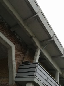 Lo stile qui è ancora déco e i materiali presentano un misto di innovazione e tradizione: calcestruzzo a vista e mattoncini marroncini, esattamente quali quelli che si vedono nelle strade circostanti; in un certo senso, da fuori il complesso sarebbe difficile capire che l’enclosure racchiuda tanta novità. Sempre dall’esterno, infatti, la lettura della tipologia non è veramente leggibile. Qualcosa si sospetta dalle grandi entrate a mo’ di ponte levatoio (in realtà dei passaggi al di sotto degli appartamenti del terzo piano), con il cemento armato lasciato a vista nel tipico arco poligonale del portale a mensole ribassato – elemento questo, del cemento armato, che viene esposto in tutta la sua potenza e crudezza non appena si varca la soglia del complesso. Si tratta della strada pensile che corre lungo quasi tutto l’interno della cinta di appartamenti, per così dire, sostenuta da pilastri free-standing, non inglobati nelle case, come fosse una piccola sopraelevata privata.