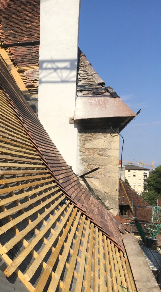 Oltre al tema tecnico della coibentazione, scelta in copertura per Bernier Est e Commis Est e al primo solaio per la Marechallerie, le tegole, a volte a doppia curvatura, prodotte con le speciali marne citate ( che cuociono a 1000 gradi), poggiate sul sistema esterno di travicelli orizzontali, hanno rappresentato di per sé un prova impegnativa per progettista e maestranze.Tuiles , provenienti da 5 fornaci, scelte, con approvazione delle superiori autorità, mixed colors e rese irregolari nel taglio. Una scelta giustificata dal fatto che, nell’edificio originale, come la pietra proveniva da diverse cave, così le tegole provenivano da diverse fornaci con ovvie differenze di forma e colore.