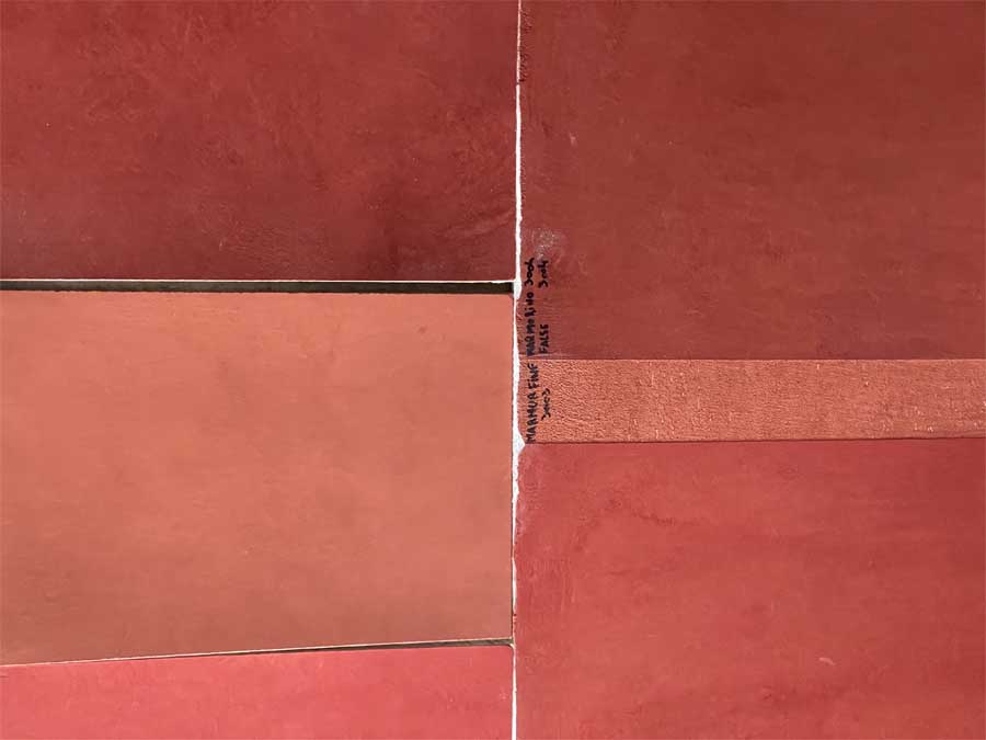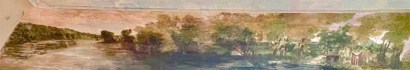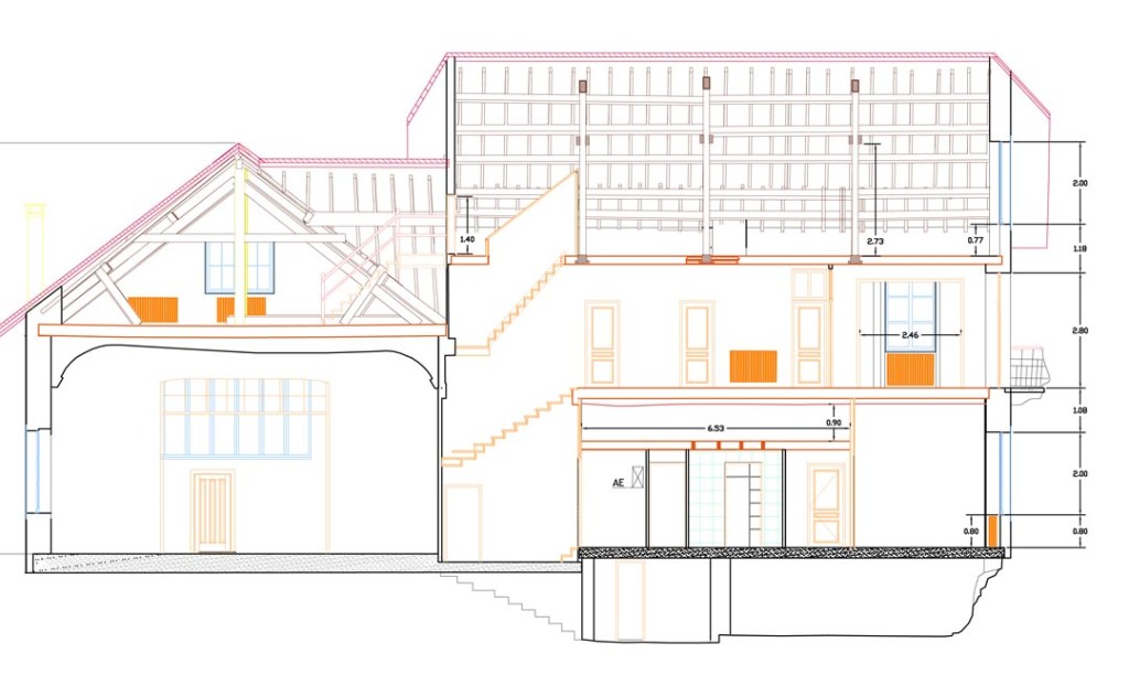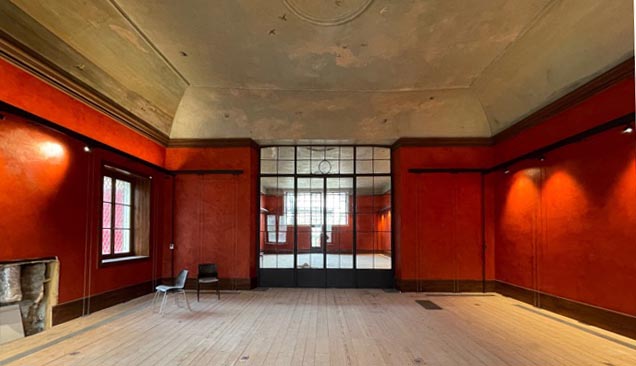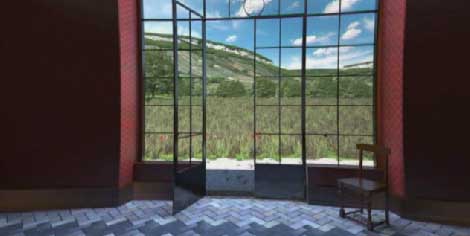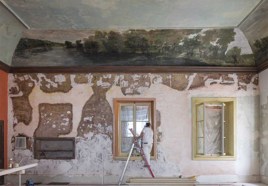 A big room with facilities, Courbet’s Atelier opened on the garden. It was covered by a flat roofing, joined to the walls with a continuos half vaults system: design choices that prove the painter’s direct intervention and the unknown architect’s skills. Courbet speaks with passionate overtones of the arrangement and extension of his orchard. Giulio Balduini, Architecte du Patrimoine of the Doubs Department, Jura Mountains, Franche-Comté region, responsible for the workshop’s restoration, was faced with a thoroughly changed situation: in fact, over the first three decades of the 20th century, a large extension was built closing the view on the garden, the adjacent room was expanded, and an extra storey added. The large window on the garden now serves as a wide special communication between the two units. This communication is emphasized by the red colour on the walls of both, a hard choice after many essays based on the remnants of the original tint.