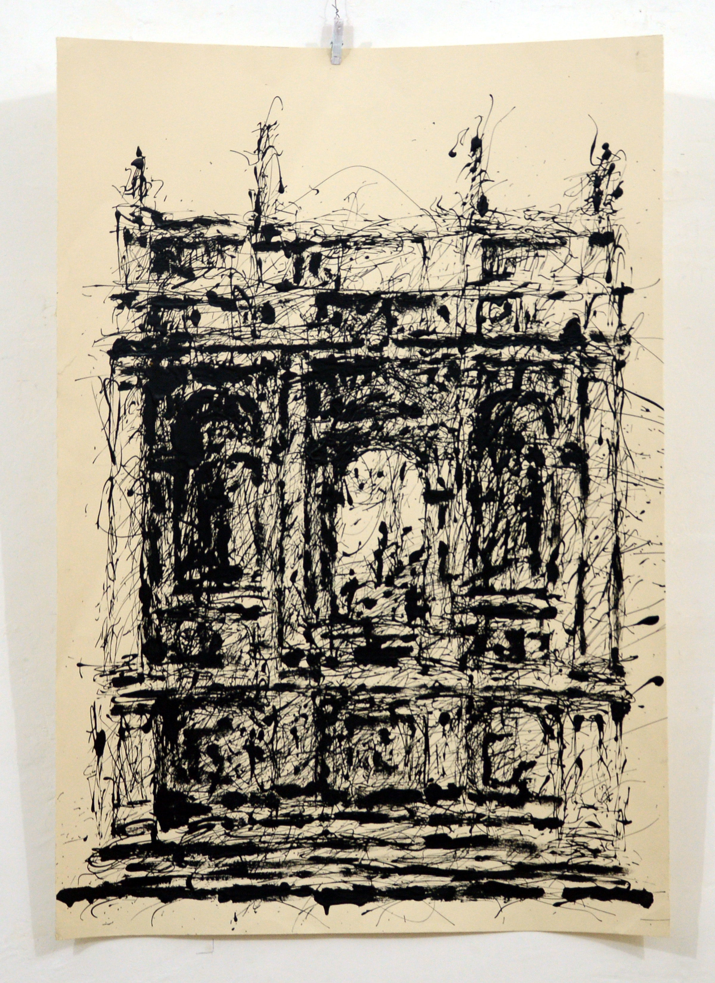 Così è certo riconoscibile l’impianto di una Pala d’altare diversa dalle altre e che appare come un colossale arco di trionfo, ma più ci si avvicina, meno il disegno diventa leggibile, più i particolari si sfaldano in un groviglio rumoroso in cui la casualità, o la ricercata casualità del mezzo si prende il compito di far diventare l’immagine ambigua. Come le alghe in laguna in un famoso pezzo di Josif Brodskij che respirano e si contraggono sinuose e notturne sotto l’imbarcadero veneziano, così lo smalto della materia di Giuliani confonde e disvela, lascia intuire cose conosciute ma non identificate, le trasforma in espressione, a metà tra architettura e arte. Che è poi, credo, il centro di tutta l’operazione. La trasformazione in memoria o in un disegno “altro” ottenuto con mezzi differenti, di un bagaglio ineliminabile di conoscenza storica. All’ architetto artista non fa certo difetto la nozione di ciò che condensa in questi suoi disegni diventati espressione di un atteggiamento critico o di un incantamento pittorico. Azzardato, ma forse indicativo, che l’autore si sia formato nella cultura veneta, tra i due picchi opposti dei quattro libri del Palladio e i neri espressionisti dei quadri di Emilio Vedova.