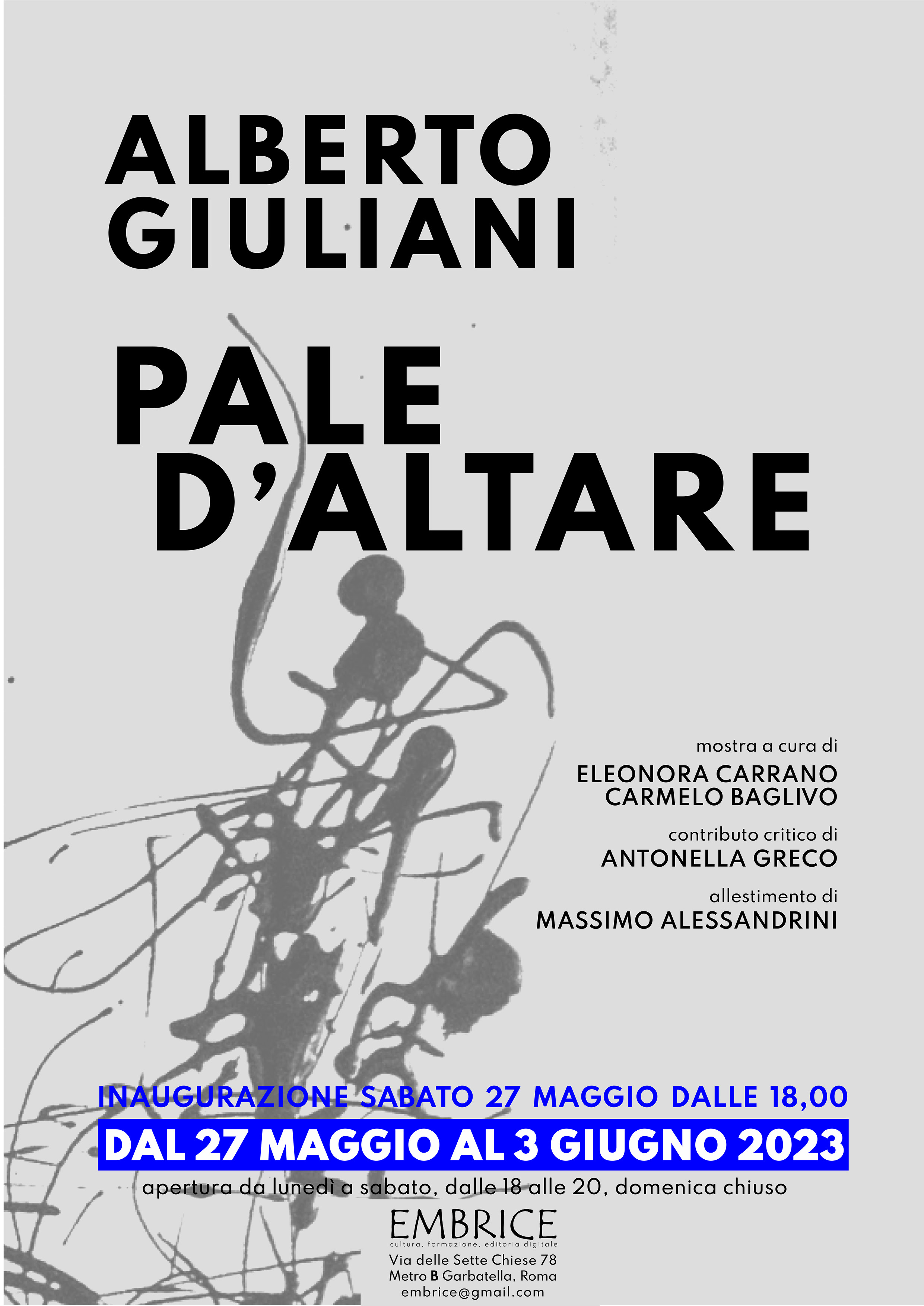 Sono esposti presso la Galleria Embrice, dal 27 maggio al 3 giugno 2023, le pale d’altare di Alberto Giuliani: 20 opere realizzate con la tecnica del dripping utilizzando smalto nero su carta. Il ciclo nasce da una riflessione storica, formale e a tratti emotiva, all’interno del legame profondo che unisce e attraversa le arti visive nella c ultura Occidentale.